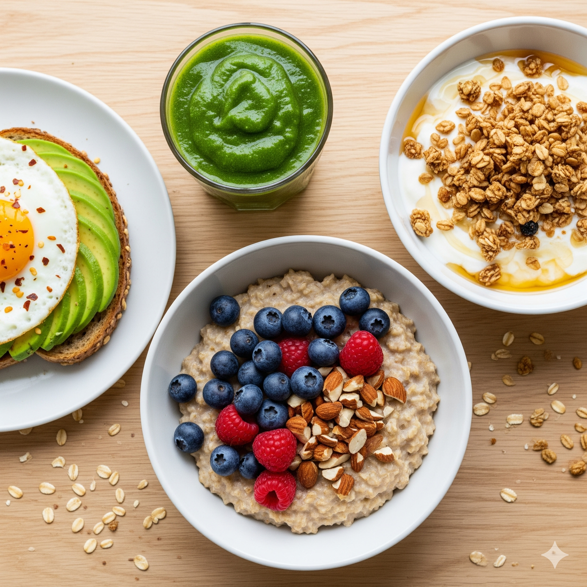 오트밀은 빠르게 조리할 수 있는 대표적인 건강 아침식사입니다. 우유나 물에 오트밀을 끓인 후, 바나나, 블루베리, 견과류 등을 올리면 맛과 영양을 동시에 챙길 수 있습니다. 식이섬유와 단백질이 풍부하여 포만감을 오래 유지할 수 있습니다.