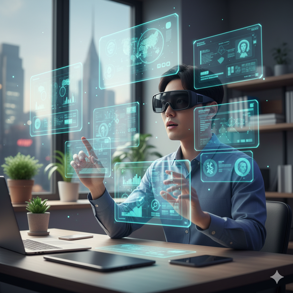 쉽게 말하면 “컴퓨터가 화면 안에 갇혀있지 않고 우리 주변 공간으로 나오는 것”이에요. 지금은 컴퓨터 쓰려면 모니터 앞에 앉아야 하잖아요. 근데 AR·VR 기기를 쓰면 어디서든, 어떤 자세로든 컴퓨터를 쓸 수 있어요.